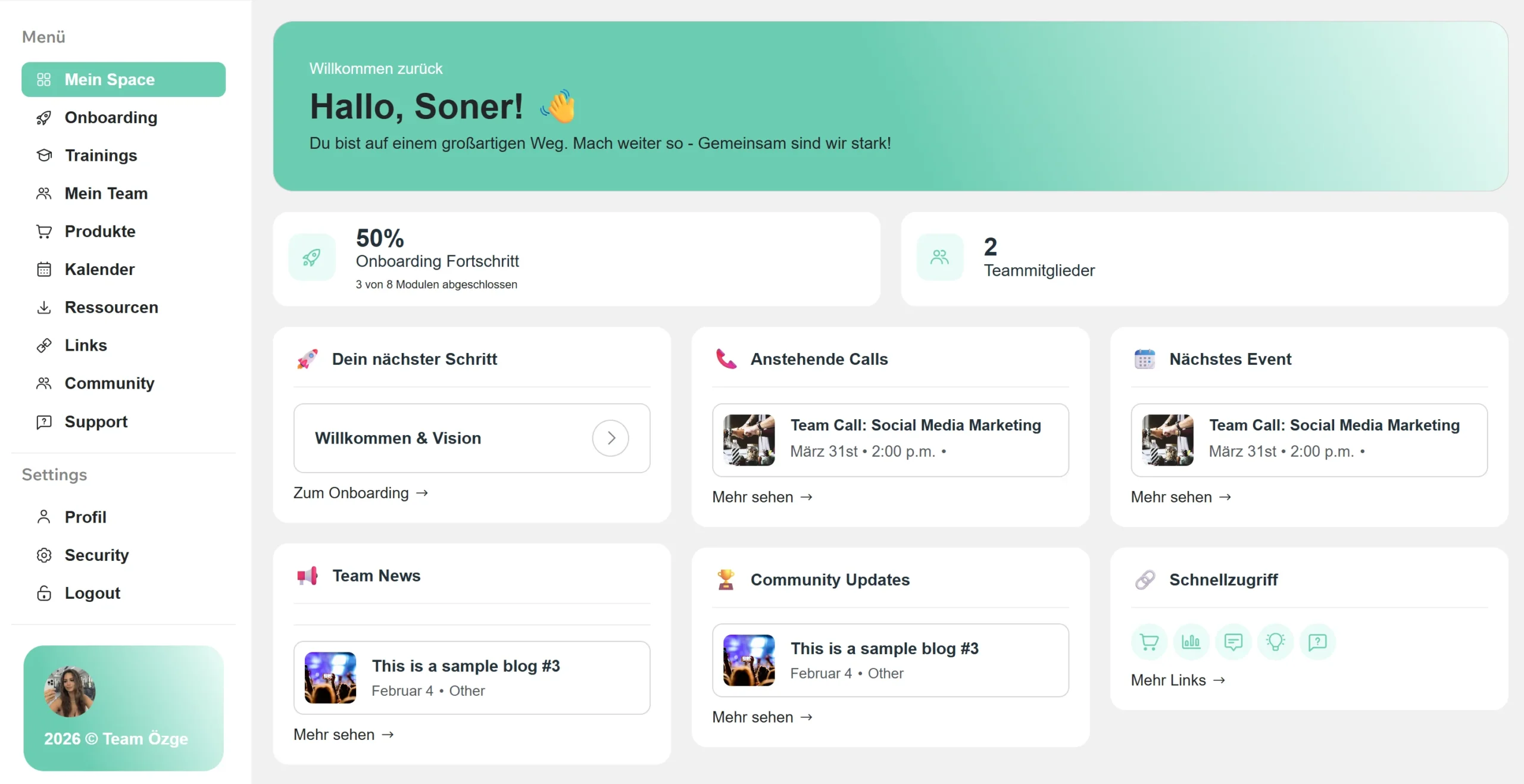 Baue dein Team professionell auf – mit deinem eigenen gebrandeten Space für Onboarding, Training und Community.
